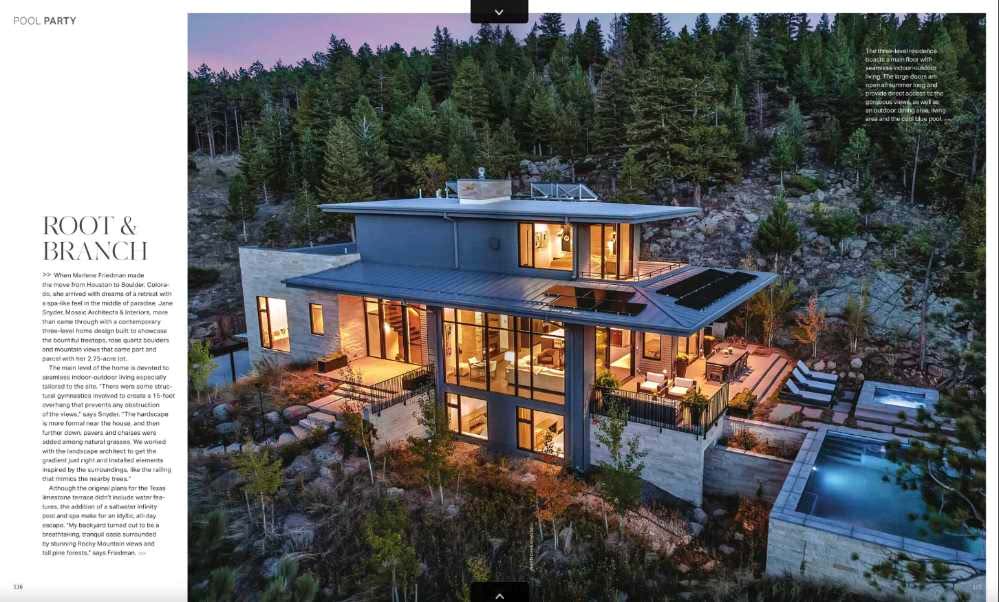 The addition of a saltwater infinity pool and spa make for an idyllic, all-day escape. “My backyard turned out to be a breathtaking, tranquil oasis surrounded by stunning Rocky Mountain views and tall pine forests,” says Friedman. Read more here